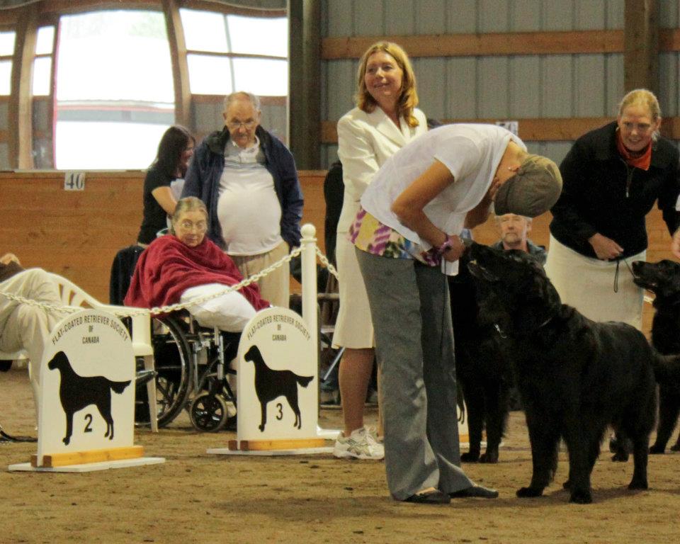 The FCR National was awesome. Like I said in my previous post - it wasn't about getting ribbons, it was about K. We met so many cool people and gorgeous dogs. Conformation is so subjective and that is what is hard about it - JUST the dog is being judged, no amount of training can prepare us for it really - hell, he hadn't had a show lead on in 2 years, and we literally just went in the ring once I put it on. In Sweeps on Thursday, he was not the judge's cup of Tea, and got dumped. Come Friday during the main Specialty classes I was unsure what to expect yet again. He was in a line-up of beautiful Veteran 9-11 boys - these are not your average overweight, limping old dogs - these dogs are all still working - yep, all of them. Mrs. Hutchinson started with the 4th place winner and went up, so you can imagine my stress when there were 3 dogs left standing there - and only one was 1st place. I was ready to leave the ring as I was sure we wouldn't be picked - like the day before ... but low and be-fricken-hold - she picked KALEB!!